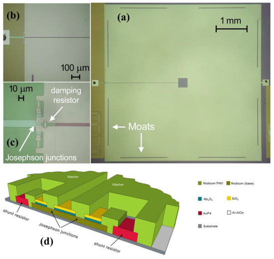 Pictures of dc SQUID magnetometer. (a) The large washer and the moats near the edge to trap magnetic vortices are visible. (b,c) Two details showing the Josephson junctions, the shunt resistors, and the damping resistor. (d) Cross section scheme of the junctions, shunt resistor, and the washer.