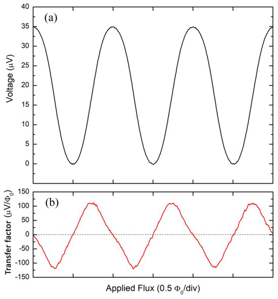 In Figure 4a, the voltage and transfer factor as a function of the external magnetic flux are reported. They have been measured at T = 4.2 K for Ibias = 19 μA. The voltage swing is ΔV = 31 μV, which is in accordance with the estimated value by the I-V characteristics. The magnetic field–flux conversion factor BΦ measured using a uniform field generated by the Helmholtz coil is 0.82 nT/Φ0 and corresponds to an effective area of 2.5 mm2. Considering that the effective area of the washer is 1.5 mm2, to which the effective area of the slit (about 0.8 mm2) must be added, the agreement is quite good.