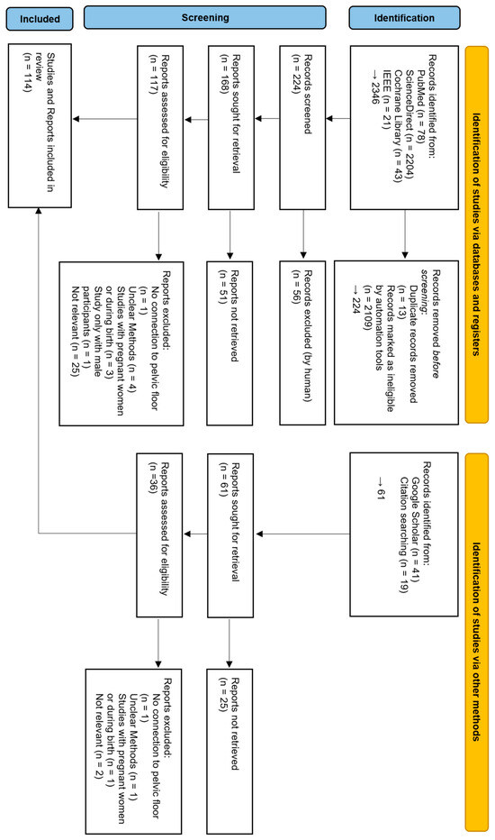 Following an initial search in GoogleScholar, a systematic search of databases was conducted. The electronic databases of PubMed, Cochrane Library, ScienceDirect, and IEEE were searched for publications in the English language. The specific search keywords and strategy with Boolean combinations were “pelvic floor” AND “sensor”. No restrictions were placed on the date of dissemination or the study design. Exceptions were made in the ScienceDirect database. Here, only the most relevant and recent publications from the years 2022 to 2024 were included in the screening process. The relevance of these publications was automatically determined by the database itself based on the number of hits, the significance and occurrence of keywords, proximity, and completeness. After the database research, manual searches of reference lists and citation tracking were undertaken to identify additional articles potentially eligible for inclusion. The search was conducted independently by two researchers in January 2024.