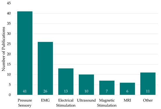 The most commonly used sensor technologies, based on the studies identified, include pressure sensors, EMG, and ES. As the review considers sensors for prevention, diagnosis and rehabilitation, the identified sensor categories can be further broken down into their application areas. For diagnostic purposes, the technologies used are pressure measurement, EMG, ultrasound, MRI, accelerometry, EMT, photogrammetry, X-ray, and IRT. Pressure and EMG measurements are also used in biofeedback systems for prevention and rehabilitation purposes. In addition, ES, MS, and vibration are used for therapeutic applications. Categorizing sensors according to their application can serve as a support for the development of new technology or methods, for example, by extending the areas of application for existing sensors. Depending on the future purpose of a new sensor, different established technologies can be used as a reference.