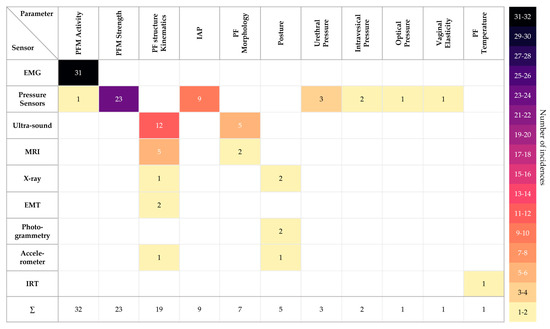 Figure 3 provides an overview of all the parameters relating to the female pelvic floor that have already been measured by sensors. The parameters listed contribute to the assessment of pelvic floor functionality. In particular, the PFM activity parameter is extensively summarized in Figure 3 and no longer differentiates between vaginal, rectal, or perirectal approaches. However, more detailed information can be found in the corresponding table, under “Sensor Position”. The color scheme in the tables shows which parameters have been measured with which sensor in how many publications. This reflects only the number of times a measurement method has been used to determine a particular parameter. The relevance and evidence of a particular parameter for assessing pelvic floor functionality should not be equated with the number of studies found for that parameter.