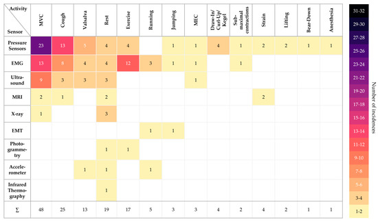 Figure 4 shows which types of activity have already been measured with which sensor technology. The color scheme for the different sensor–activity combinations merely illustrates the number of studies identified; thus, it should not automatically be equated with the relevance of a sensor technology for measuring a particular activity.