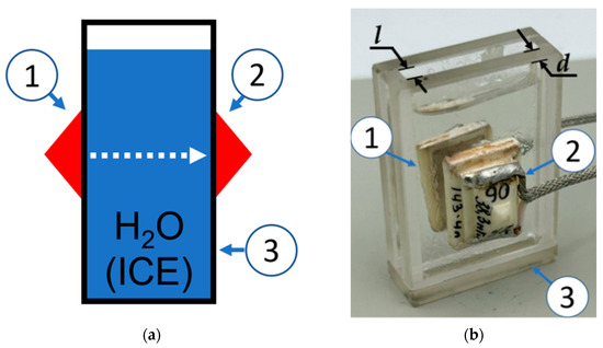 Figure 1 shows a schematic view (a) and a photo (b) of the sensor for registering of the liquid–ice phase transition using BAW. It consists of an input transducer (1), an output transducer (2) and a cell (3) for testing liquid or ice. Z-cut LiNbO3 (3 × 4 mm2 in area) operating at f = 3–30.9 MHz were used as the LBAW transducers (JSC “Research Institute “ELPA”, Moscow, Russia). YX quartz (8 × 13 mm2 in area) operating at f = 10–37 MHz served as the SVBAW transducers (JSC “Research Institute “ELPA”, Moscow, Russia). The transducers were glued to the cell using epoxy resin, which provided good acoustic contact over a temperature range of −25 °C to +60 °C. The cells were made from fused quartz with a wall thickness of d = 2.5–2.7 mm and a wall-to-wall distance of l = 3–17.5 mm. The material constants of fused quartz were taken from [31]. It should be noted that as the distance l increases, the perturbation of the test sample by the cell walls decreases. However, at the same time, acoustic attenuation in the test medium also increases with increasing distance l. Therefore, each measurement requires a careful balance between the liquid perturbation and the wave attenuation.