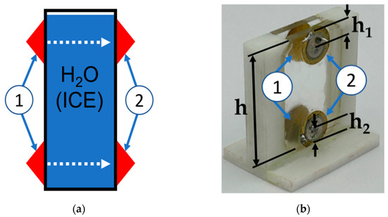 (a) Schematic view and (b) photo of the LBAW sensor for detecting ice homogeneity: input LBAW transducers (1), output LBAW transducers (2), and cell for ice sample at h = 30 mm, h1 = 4 mm, h2 = 4 mm, fL = 13 MHz, l = 17.8 mm, and d = 3.1 mm.