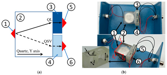 The schematic view (a) and photo (b) of the dual BAW sensor are shown in Figure 3. The sensor consists of an input transducer (1), a bare quartz crystal (2), a Teflon cell with two isolated chambers, (3) and (4), without a wall between them and the quartz crystal, and two output transducers, (5) and (6), glued to opposite wall of the cell. The dimensions of the quartz crystal are 32 mm in the Z and Y directions (lz = ly = 32 mm), and 16 mm in the X direction (lx = 16 mm). The height h of the chambers (3) and (4) is 16 mm. The transducers are made of polarized piezo-ceramics PZT-17, which vibrates at f = 13 MHz in the longitudinal direction (JSC “Research Institute “ELPA”, Moscow, Russia). The thickness of the chamber walls d is 1 mm, and the distance l between end of the quartz crystal and the chamber wall (the length of the test medium along the wave propagation direction) is 7 mm. The chambers were sealed using epoxy resin. One chamber was filled with distilled water, while the other one was filled with a 0.9% solution of NaCl for testing purposes.
