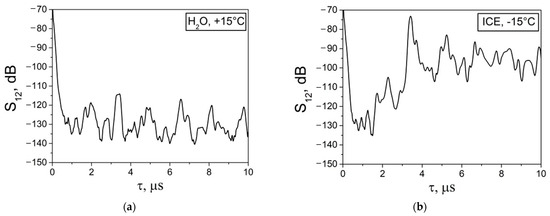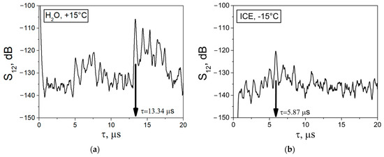 The dependences of the insertion loss S12 vs. time delay τ measured for SVBAW in distilled water (a) before (T = +15 °C) and (b) after (T = −15 °C) phase transition at fSV = 25 MHz, l = 3.3 mm, d = 2.7 mm.