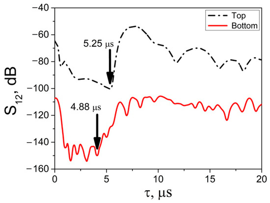 Insertion loss S12 vs. time delay τ measured at top (black line) and bottom (red line) ends of ice sample at T = −20 °C, h = 30 mm, h1 = 4 mm, h2 = 4 mm, fL = 13 MHz, l = 17.8 mm, d = 3.1 mm, and = 37.5 dB (top) and 42.5 dB (bottom).