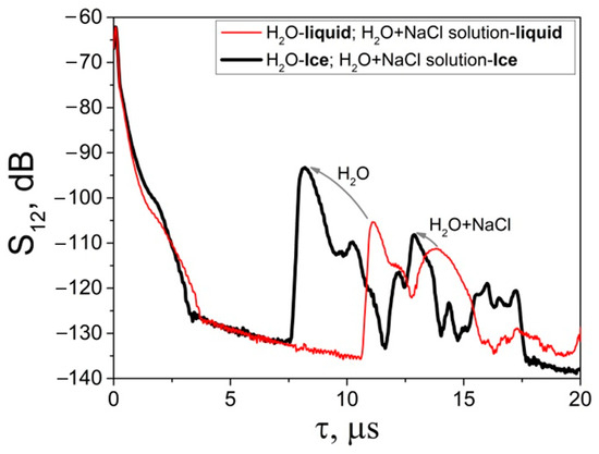 The dependence of insertion loss S12 on time delay τ measured for the dual BAW sensor developed (Figure 3) is shown in Figure 7. The delay time for each signal is the sum of the partial delays acquired by the wave in the quartz crystal (32 mm), the test medium (7 mm), and the cell walls (1 mm). The total delay time calculated from the sum of partial delays agrees with the experimental data within experimental error (Table 5). Similarly, the insertion loss in each channel can be expressed as the sum of losses in transducers, glue layers (epoxy), and the test medium. Specifically, the decrease in insertion loss S12 for ice samples at a negative temperature (Figure 7) can be attributed to improved epoxy contacts between the transducers and the quartz crystal, as well as between the transducers and Teflon cells.