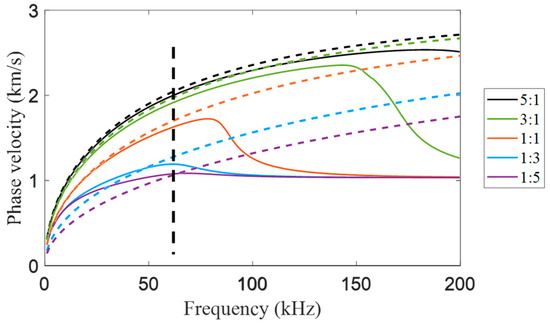 Dispersion curve of A0 mode phase velocity under different thickness ratios of aluminum–epoxy adhesive laminates. The position of the black dashed line indicates a frequency of 70 kHz.