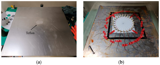 Guided wave detection experiment photo of a steel–cement bilayer plate. (a) Irregularly shaped PTFE film adhered to a 2 mm thick steel plate. (b) Twenty-four piezoelectric transducers mounted on the steel–cement bilayer plate.