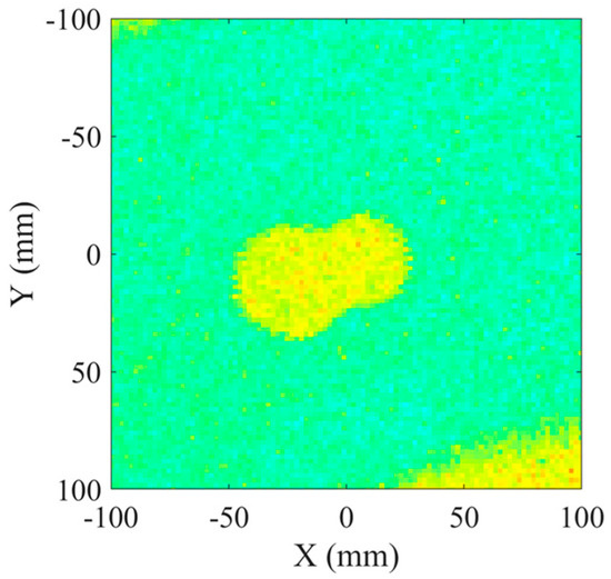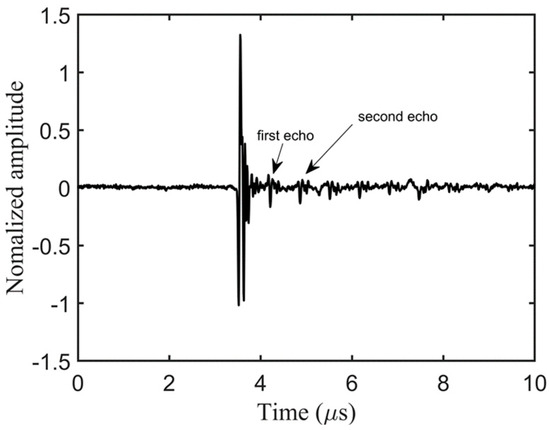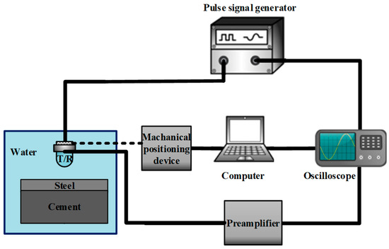 To assess the bonding quality, we initially employed the conventional pulse-echo method for inspecting the bonding condition of the steel–cement bilayer plate. Figure 8 illustrates the experimental setup for pulse-echo debonding detection. The bilayer plate in the lower left corner represents the test specimen, with “T” denoting the emitter and “R” indicating the receiver. During measurements, the emitter transmits ultrasonic waves vertically toward the plate. A mechanical positioning device is employed to comprehensively inspect the specimen using the “S”-shaped water immersion scanning method. The experiment utilized an 5072PR (Olympus, Tokyo, Japan) pulse signal generator as the excitation device, which stimulated the emitter. Additionally, the emitter served as the receiver to collect the signals. The collected signals passed through a preamplifier, were displayed on an oscilloscope, and were stored in real time on a computer. Figure 9 shows multiple echo measurement signals obtained at one of the positions on the plate [35]. The first and largest peak represents the echo signal from the top surface of the plate and does not contain any information about defects within the plate. The first and second echoes indicated by arrows are the signals used to assess the bonding quality. To determine the presence of debonded areas, one only needs to calculate the ratio of the maximum peak of the first echo to the maximum peak of the second echo. Figure 10 displays the imaging results obtained after multiple-wave amplitude processing of the collected array data. The yellow area in the image indicated poor bonding quality, while the green area indicated good bonding. The image clearly revealed an “8”-shaped debonding defect in the middle caused by the PTFE film, confirming the experiment’s feasibility. However, despite offering high imaging accuracy, traditional ultrasonic scanning is relatively slow. Therefore, we evaluated the bonding quality using the guided wave tomography technique based on full waveform inversion.