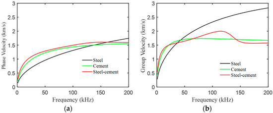 Dispersion curve of A0 mode waves in steel–cement laminated plate. (a) Phase velocity. (b) Group velocity.