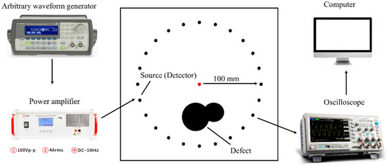 Ultrasonic testing stands out as a significant non-destructive evaluation method, providing high-resolution detection of subsurface defects such as corrosion, delamination, voids, and cracks in materials [3,4,5]. Conventional ultrasonic testing typically employs bulk waves, characterized by high frequency and short wavelengths relative to the component thickness. While this approach yields high detection accuracy, it exhibits lower efficiency when dealing with large-area components. By contrast, guided wave inspection employs signals with wavelengths comparable to the thickness of the structural walls, enabling the inspection of large-area components [6]. Guided wave non-destructive testing and structural health monitoring employ guided wave array imaging technology, which facilitates rapid localization and identification of cracks, through-holes, and delamination damage in plate-like structures [7].