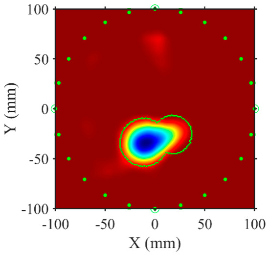 Figure 15 presents the reconstructed location of the delamination defect at the highest frequency obtained via the FWI algorithm. The blue area delineates the reconstructed delamination region, while the red area denotes the uniformly bonded region. The green dots mark the transducers’ positions, and the green dashed lines indicate the original delamination region’s extent. Despite minor shape distortions and artifacts, likely due to uneven cement thickness, the position of the delamination area is accurately reconstructed. These results confirm the effectiveness of the proposed method in reconstructing the delamination area’s shape and position. Compared with traditional pulse-echo delamination detection methods, the FWI-based guided wave detection method offers expedited detection.