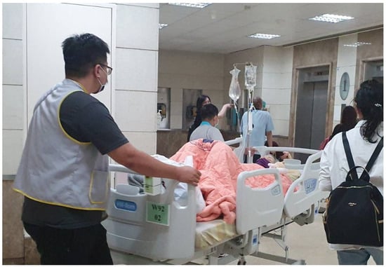 Efficient patient flow is critical for optimal hospital operations, impacting patient satisfaction, resource utilization, and overall costs; however, many hospitals, including Taichung Veterans General Hospital in Taiwan, need help with inpatient transportation. These challenges often stem from budget constraints and staffing shortages, further exacerbated by systemic issues within the Taiwanese healthcare system [1,2,3], such as limited government oversight and commercial pressures. Inefficient, manual processes for inpatient transportation can lead to bottlenecks, delays, and increased staff workload, hindering timely care delivery (example in Figure 1) and contributing to patient dissatisfaction.