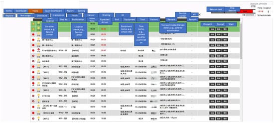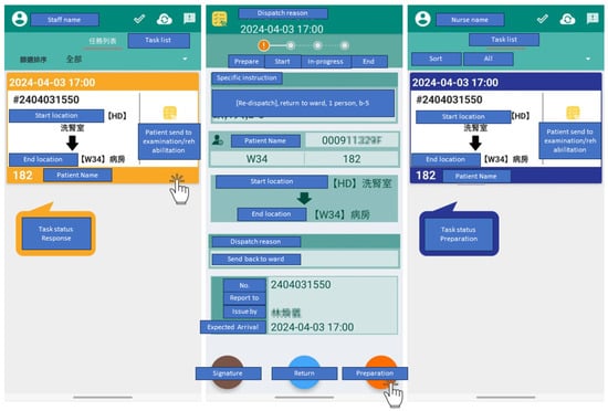 The experiments were conducted in a real-world hospital environment. The new Beacon dispatch system is integrated to automatically distribute tasks to existing mobile applications, as shown in the example application in Figure 4. The hospital’s transport staff were classified into two distinct groups: distributed dispatch staff (assigned to specific wards or departments) and centralized dispatch staff (working in shifts across service centers). The task’s urgency dictated the transport staff’s response time: immediate response for emergencies, within 15 min for urgent cases, and 30 or 60 min for routine tasks.