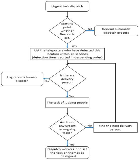 The Beacon dispatch system operates with a 10-s scanning interval to identify available personnel. During each scan, the system prioritizes tasks of pickup times within the next 3 min. Within this window, tasks are further sorted by urgency level, ensuring that the most time-sensitive requests are addressed first.