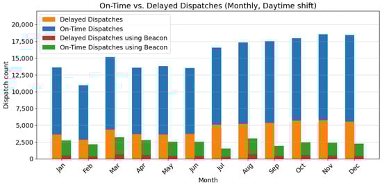 The analysis presented in Figure 5 and Figure 6 reveals key insights into the dispatch performance across day and night shifts, particularly highlighting the impact of using the Beacon dispatch system. The data indicate a consistent demand for dispatch services, with a slight increase towards the end of the year, suggesting a steady or growing demand for dispatch services. In addition, there is a significant gap between on-time and delayed dispatches, especially during the night shift, which could be attributed to the lower number of active hospital staff and patients compared to the day shift.