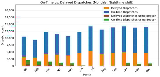 Monthly dispatch performance (nighttime shift), showing the number of on-time and delayed dispatches for traditional vs. Beacon dispatch system.