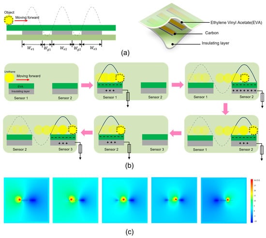 Figure 1a shows the schematic of the main structure of an acceleration sensor based on a single-electrode TENG. The three sensors are embedded equidistantly beneath a mat composed of carbon material and cut to equal size using a laser cutter (C30 Laser Machine, CORYART Company, Anyang, Korea). The three sensors are adhered equidistantly under the pad with leads, as shown in Figure 1a on the left. Note that the signal generation method of the TENG here is a single-electrode mode, so one end of the sensor needs to be in contact with the ground. Since the environment is indoors, an insulating layer is added below the sensor to ensure the efficient transmission of electrons. Figure 1a on the right shows a structural diagram of the sensor, with three sensors equidistantly embedded in the mats and insulating materials. The mat material consists of ethylene vinyl acetate (EVA), the sensor is made of carbon material, and the bottom insulation material is plastic film. The carbon material of the accelerometer produced is easy to obtain, has a rectangular structure of 210 length × 60 width, and weighs 1.407 .