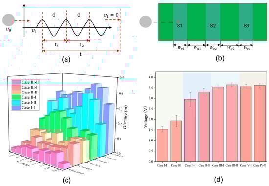 Measurements and performance analysis of the acceleration sensors. (a) Calculation of the acceleration and distance based on the voltage signals generated by TENGs. (b) The object passing over sensors of different widths and space . (c) Errors between the theoretical distance and the actual measured distance for different sensors at various speeds. (d) The maximum voltage generated by the object when passing over different sensors.