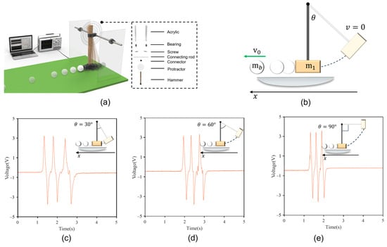 Experimental platform and response characteristics. (a) Schematic of the ball motion test under different initial kinetic energies. (b) The object acquires different initial kinetic energies by falling through different angles. (c–e) Graphs of the Voltage−Time relationship of the object rolling forward across the mat after gaining kinetic energy from the hammer falling from angles of 30, 60, and 90°, respectively, as shown in each inset.