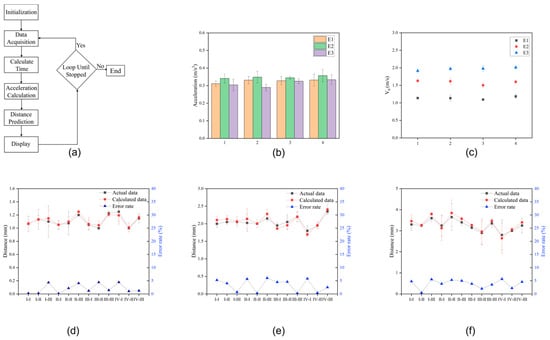 Comparison of different performances of the TENG-based acceleration sensors. (a) Algorithmic block diagram of acceleration sensors. (b,c) The acceleration and speed display, respectively, of the object passing through different types of sensors under different initial kinetic energies. (d–f) The predicted distance and actual distance that the object can roll under different initial kinetic energies and the error involved, respectively.