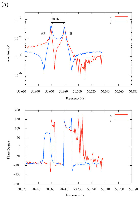 Then, the non-diagonal term, i.e., the coupling stiffness, was controlled by an unbalanced tuning condition, . According to Equation (15), the coupling stiffness and the stiffness unbalance were controlled by and , respectively. Figure 12 shows some examples of the experimental results. The minimum frequency mismatch was reduced to approximately 20 Hz under the tuning condition that , at which the effective coupling stiffness became small (Equation (8)). In this condition, the frequency of the AP mode was smaller than that of the IP mode, indicating that was negative. The minimum frequency mismatch was further reduced to 7 Hz when . In this condition, the frequency order was swapped, which means became positive. Theoretically, becomes zero in between these two conditions, which means the sensitivity becomes infinity.