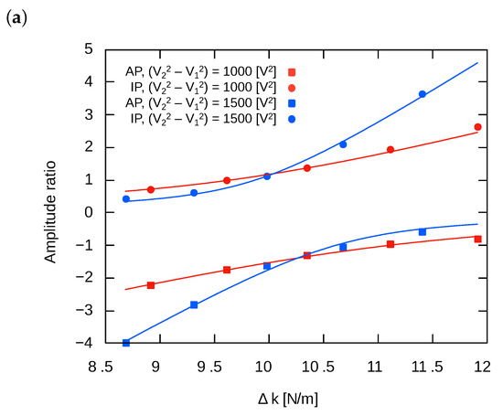 The amplitude ratios were obtained by fitting the frequency response data to the double Lorentz functions, as described in Section 3.2. Figure 14 shows the obtained amplitude ratios. The data were fitted to the equation of the amplitude ratio (Equation (10)) using as the fitting parameter. The point near the amplitude ratio is 1 or , and the plots of experimental results with different intersect. This indicates that, at this point, the structural mismatch is perfectly compensated by electrostatic tuning, resulting in a state where . From this result, it can be inferred that for the oscillator used in this experiment, the mismatch in the X and Y axes due to fabrication imperfection was approximately 10.2 N/m. Table 2 and Figure 15 summarize the obtained effective coupling stiffness. As can be seen, the amplitude ratio followed the theory well, and the effective stiffness could be controlled by the tuning voltages. The coupling stiffness linearly changed with respect to , which means the proposed tuning method worked well. The tuning efficiency of effective coupling stiffness for AP and IP modes were and , respectively. Those values are close to the theoretical value:
