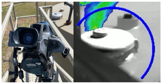 - The field crew identified an unobstructed view of the leak source with the gas plume, considering wind direction, measurement distance, and plume background. This was carried out by observing the emission source from multiple perspectives and distances to find the “best view” of the plume (as adjudged by the measurement crew) with enough space to accommodate the camera tripod and camera operator [66]. The field crew mounted the camera on a tripod and positioned it with the emitting source at the center of the measurement boundary as shown on the tablet’s screen (see Figure 2).