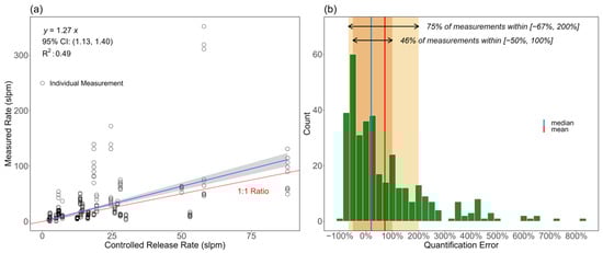 Quantification accuracy of individual estimates: (a) measured rates versus controlled release rate and (b) distribution of quantification error of individual estimates. In (a), the blue line represents linear regression through the origin with the gray shading showing the 95% confidence interval of the regression when bootstrapped. The red line represents the 1:1 ratio, where the measured rate matches the controlled release rate. In both cases, the intercept was forced to zero. In (b), the orange shading represents the measured rate within a factor of two of the controlled release rates (−50% to 100% quantification error), and the yellow shading represents the measured rate within a factor of three of the controlled release rates (−67% to 200% quantification error).