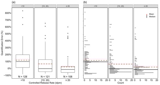 Boxplots (a) and distribution (b) of the quantification errors of individual estimates based on controlled release rate (<10 slpm, [10, 20) slpm, and ≥20 slpm). The black, circular markers in (a) represent outliers as data points outside 1.5 times the interquartile range of the data in each group. The horizontal, black solid, and red dotted lines in both (a) and (b) indicate the median and mean of the distribution in each group, respectively.. The x-axis represents the groups within each parameter, and the y-axis shows the quantification error in percentage. The numbers at the bottom of the boxplots represent the sample sizes of individual estimates within each group.