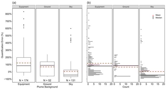 Results from the various quantification backgrounds with statistical (using Mann–Whitney U test) different error distributions (p < 0.05) are presented in Figure 5. The mean and median quantification errors for ground, equipment, and sky as plume background are +68% (95% CI [+40%, +97%]) and 89%, +122% (95% CI [+98%, +150%]) and 84%, and +5% (95% CI [−13%, +32%]) and −44%, respectively. Some parts of the ground at METEC were covered in vegetation that moved with the wind which made quantification challenging; however, as hinted earlier, reflections and glint from equipment also affected measurements when equipment was the plume background. While a cloudy sky also made quantification challenging, a clear sky was the most favorable background for quantification, noting that the outliers shown in Figure 5a (quantification errors between 400% and 600%) were estimates conducted under high windspeeds (Supplementary Materials Table S4). This result agrees with findings from previous studies and recommendations in the FLIR user manual: clear sky with low apparent temperature provided the best thermal contrast for the tablet’s quantification algorithm [65,66].