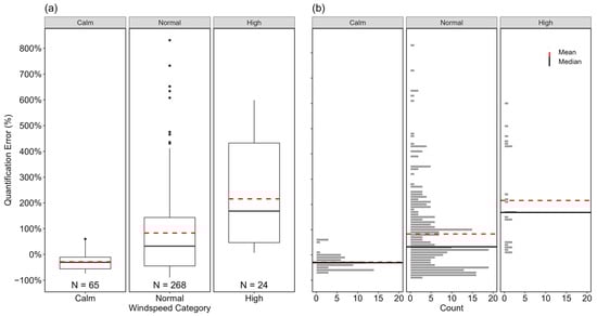 Boxplots (a) and distribution (b) of quantification errors of individual estimates based on wind speed categories (calm: 0–1 mph; normal: 2–10 mph; or high: >10 mph). The black, circular markers in (a) represent outliers as data points outside 1.5 times the interquartile range of the data in each group. The horizontal, black solid, and red dotted lines in both (a) and (b) indicate the median and mean of the distribution in each group, respectively. The x-axis represents the groups within each parameter, and the y-axis shows the quantification error in percentage. The numbers at the bottom of the boxplots represent the sample sizes of individual estimates within each group.