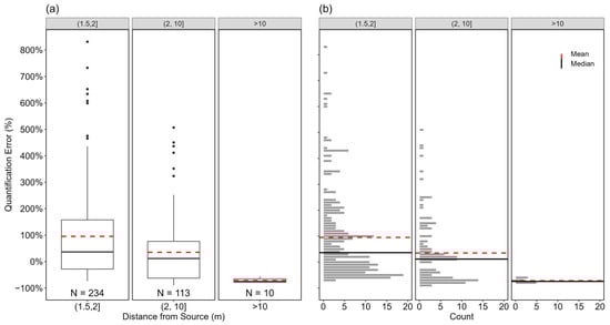 The FLIR and Legacy tablets’ interface allows distance input in 0.5 m increments. Therefore, all measured distances were rounded to the closest half-meter. Due to the small sample size (N = 10), measurements at distances > 10 m are ignored in this discussion. As shown in Figure 7a, the mean and median errors of measurements within 2 m and (2, 10] m of the emitting source were +95% (95% CI [+75%, +118%]) and +36%, and +35% (95% CI [+14%, +62%]) and 12%, respectively. With the error distributions of measurements from both distance categories statistically different (using the Mann–Whitney U test), and the estimates from the latter distance category having lower mean and median errors with a tighter interquartile range of around 0%, the result indicates that moving the camera closer to the emitting source did not result in better quantification performance.