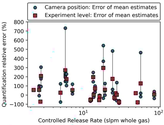 A plot of quantification relative error (linear scale) against controlled release rate (log scale). The green markers represent quantification relative errors associated with the mean of individual estimates at a camera position. The whiskers join green markers obtained during the same experiment. The red, square markers represent the mean of individual estimates obtained for each experiment.