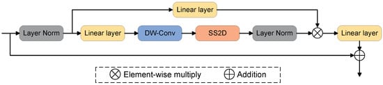 This module divides the input into two branches after the feature map undergoes layer normalization. In the first branch, the feature map goes through a linear transformation then multiplies with a weight matrix followed by the activation function SiLU. In the second branch, the input also passes through a linear layer and the corresponding activation function and then uses depthwise separable convolution for shallow feature extraction with a small number of parameters. After this, it enters the 2D selective scan (SS2D) module for further deep feature extraction. Subsequently, layer normalization is used to normalize the thoroughly extracted features, which are merged with the first branch’s output through element-wise multiplication to form a deep feature representation that includes shallow information. Finally, a linear layer is used to mix the features, and the output of this layer is combined with residual connections to form the output of the VSS module.