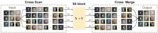 SS2D consists of three parts: the scan expansion operation, the S6 module, and the scan merge operation. As shown in Figure 3, the image’s scanned blocks are expanded into four sequences, each consisting of several small-sized images obtained from different scan divisions. The scanning continues in four directions, allowing the central pixel to integrate information from other pixels in different directions. After scanning, the formed sequences are processed by the S6 module for feature extraction, ensuring that information from all directions is thoroughly scanned to capture different features. Then, the scan merge operation sums and merges the sequences from the four directions.