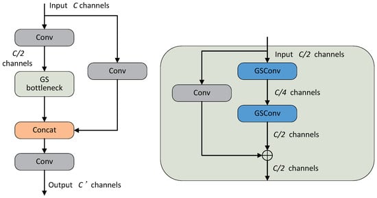 In HeMoDU, GSConv is applied within the VoV-GSCSP module, as shown in Figure 4. HeMoDU uses a one-shot aggregation strategy to design the cross-stage partial network module, VoV-GSCSP. The input features are extracted through convolutional layers and separable convolutional layers then concatenated with the information from the residual connection path that has been convolved to change the number of channels. In this way, HeMoDU preserves the hidden connections between channels and promotes cross-channel information exchange, thus maintaining sufficient accuracy while reducing computational and network structural complexity.
