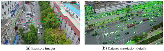 The VisDrone2019 dataset [30] was collected and developed by the AISKYEYE team from the Machine Learning and Data Mining Laboratory at Tianjin University. The images and video clips in this dataset were captured by various UAV cameras, spanning thousands of kilometers across 14 cities, and include different geographical environments such as urban and rural areas, different objects such as pedestrians and vehicles, and different densities such as sparse and crowded, totaling 10,209 samples. Among them, 6471 samples were used for training, 548 for validation, and 3190 for testing, with more than 2.6 million target boxes manually annotated. Figure 6 shows some samples and annotations from this dataset. The images contain rich content, including a large number of targets with multi-scale and uneven distribution characteristics. This dataset categorizes these targets into 11 classes: pedestrian, people, bicycle, car, van, truck, tricycle, awning-tricycle, bus, motor, and others. This dataset can be used for multi-object detection tasks in urban road scenarios.