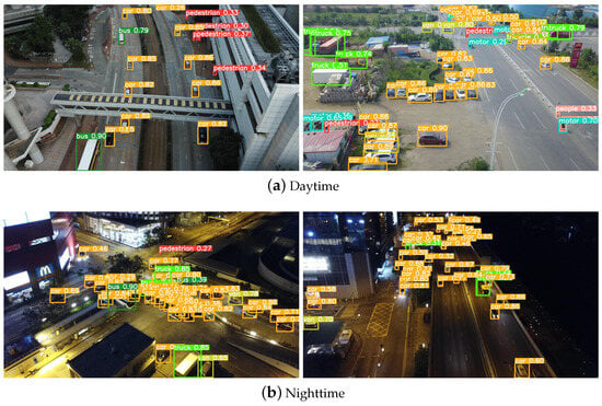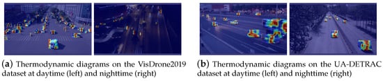 Figure 8 and Figure 9 show the visualized detection results of the samples in the Visdrone2019 dataset and the UA-DETRAC dataset, respectively. The proposed HeMoDU can precisely classify objects in road scenes with both clear and dim lighting conditions. It is able to distinguish the pedestrian objects from the car objects in heavy traffic scenes as well, as evidenced by Figure 8a. As shown in Figure 9, the proposed HeMoDU model can also identify car objects of multiple sizes precisely, so the method performs well on the car and bus categories, as shown in Table 6. In addition, Figure 10 shows the corresponding thermodynamic diagrams. In both figures, HeMoDU can effectively focus on the features corresponding to the main targets. During the day, HeMoDU can accurately identify multi-scale targets, including bicycles, which enables the model to have a good detection effect on targets with different scale features. In addition, under the highly challenging nighttime scene, HeMoDU can still effectively recognize typical road targets such as cars. This demonstrates the capability of HeMoDU for object detection under complex conditions.