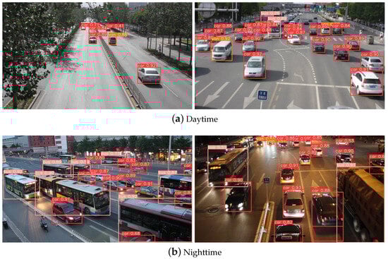 The UA-DETRAC dataset is a widely used, large-scale, open-source dataset for vehicle detection and tracking [31]. This dataset serves as a challenging benchmark for real-world multi-object detection and tracking models. The data primarily consist of high-definition video surveillance footage from 24 roads in Beijing and Tianjin, recorded at 25 frames per second with a resolution of 960 × 540 pixels. The data include scenarios across four weather conditions: sunny, rainy, daytime, and nighttime. Researchers have categorized the vehicles in the dataset into four classes: car, bus, van, and others. Based on this categorization, over 140,000 frames and 8250 vehicles were manually annotated, totaling 1.21 million object-bounding boxes. The training set contains approximately 82,085 images, while the test set contains about 56,167 images.