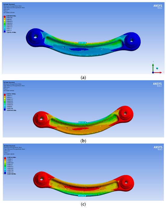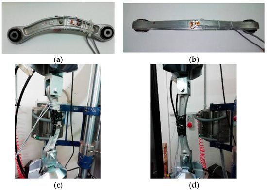The loading system was designed to apply a unidirectional tensile/compressive stress using the component bushing holes (Figure 2c,d). The loading machine used was an MTS 810 with a capacity of 100 kN. The applied loads were typical forces that load the suspension components, as suggested by the car producer. The tests were conducted using load control mode, applying a force ranging from 0 to 3000 N, followed by a return to 0 N, and inducing a compression from 0N to −3000 N. The cycle concluded with unloading.