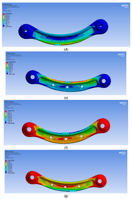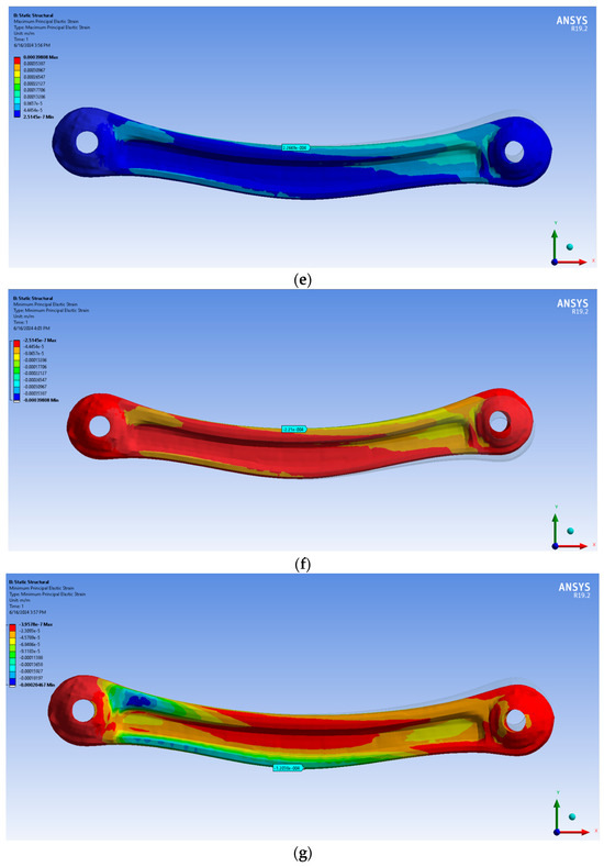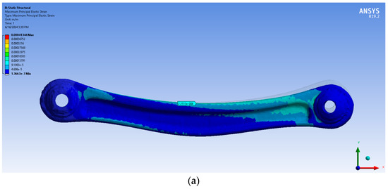 This variation is measured using the Wheatstone bridge. The Wheatstone half-bridge connection [22,23,24,25,26] was used for all suspension components to compensate for spurious deformation (Figure 2a–f).