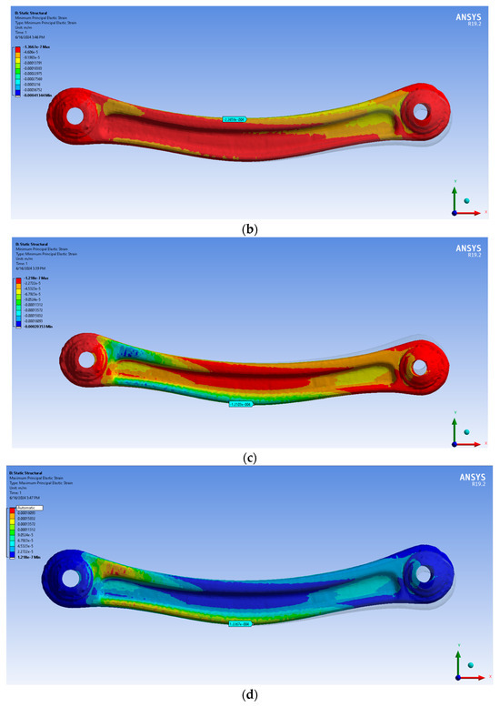 The maximum stress for traction and compression was also evaluated for the red (Figure 12a–d) and the green suspension (Figure 13a–d).