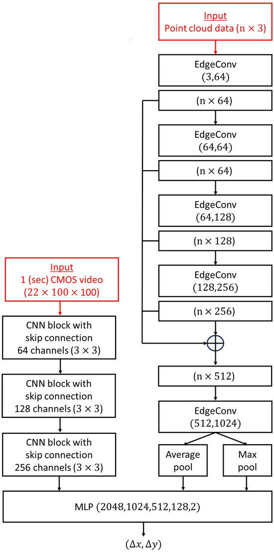 The network architecture detailed in this manuscript features a dual-input system designed specifically for the task of calibrating data from two distinct camera technologies: the conventional CMOS (complementary metal–oxide–semiconductor) camera and the innovative event camera. This setup is essential for effectively processing and integrating the disparate data types that these cameras capture. Figure 4 displays the DGCNN-CNN calibration network architecture, which employs a dual-input strategy to process and synchronize inputs from both CMOS and event cameras efficiently. The diagram details the data flow within the network, showing separate pathways for CMOS video and event camera data that converge to a unified calibration output. This visual representation elucidates the system’s architecture, highlighting how distinct data streams are integrated and processed.