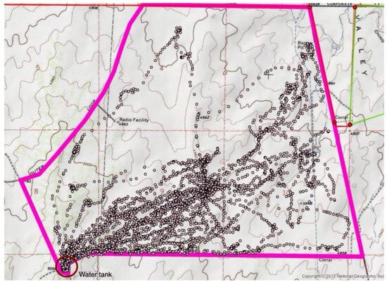 The cattle tracking data supporting this study were summarized and first published by Tobin et al. (2021), which is cited below [16]. Requests from the cattle tracking data collected at Deep Well Ranch and used in this study must be directed to the authors and approved by New Mexico State University and Deep Well Ranch.