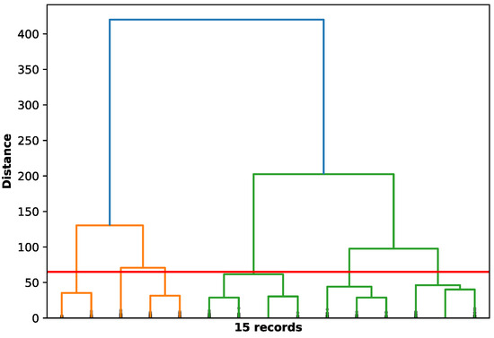 Dendrogram obtained using hierarchical clustering. The horizontal red line is the selected threshold for cow 225. Different colors are used to represent different hierarchical clusters.