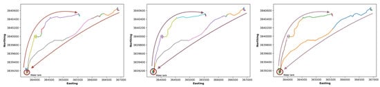 Effect of window sizes (1, 2, and 3) on segmentation for cow 225 on 20 June 2018. The map on the left uses a window size of 1 for segmentation, and the middle and right maps show segmentation with window sizes of 2 and 3, respectively. (Color changes within a map reflect different segments. Fewer segments were assigned to this portion of the trajectory with larger window sizes (1 vs. 2 vs. 3).