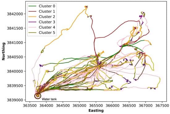 Six different clusters were created by aggregating segments using the rate feature (Figure 6). In contrast to our expectations, the distance to water was not useful for clustering. Six different colors represent six different clusters with 26 days of data from one cow (Figure 6). For example, the segments belonging to the pink cluster (Figure 6 Cluster 4) are aggregated, indicating that the cow stayed at the same location, and direction changes are likely from GPS error. Intuitively, this cluster indicates that the cow is resting. The olive (Figure 6 Cluster 5), crimson (Figure 6 Cluster 1), and purple (Figure 6 Cluster 3) clusters represent successive positions relatively long distances apart along the same general course, which suggests walking behavior. The green (Figure 6 Cluster 0) and orange (Figure 6 Cluster 2) clusters are tortuous while the cow moves and switches directions, which might indicate grazing. These clusters represent typical behavioral activities of cattle and could be used to monitor their health and well-being. For example, cattle that rest and limit their grazing during the early morning and evening (normal grazing bouts) may be ill. Tobin et al. [30] found a distinct change in the diurnal behavior pattern of grazing when cattle became ill with bovine ephemeral fever. Grazing activity markedly declined at the onset of their illness, which was especially noticeable in the morning and evening. Identifying these clusters and the associated behavior (i.e., labeling, see below) facilitates the remote monitoring of cattle grazing rangelands and the potential detection of illness and other welfare concerns [5,11].